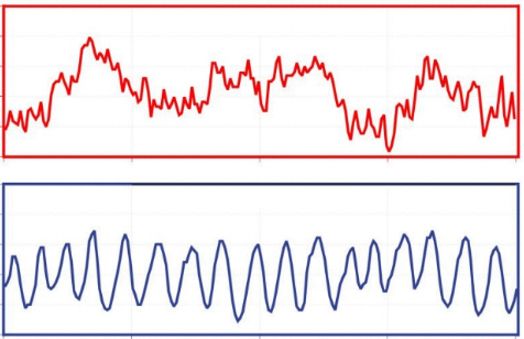 In de bovenstaande afbeelding zie je twee soorten ademhalingen. De bovenste is van iemand die druk is en geen controle heeft over zijn/haar ademhaling. De oorzaak kan zijn dat hij/zij te veel ademhalingen per minuut heeft. De onderstaande afbeelding is van iemand die vanuit controle ademhaalt. Die is te zien aan de vloeiende pieken en dalen.